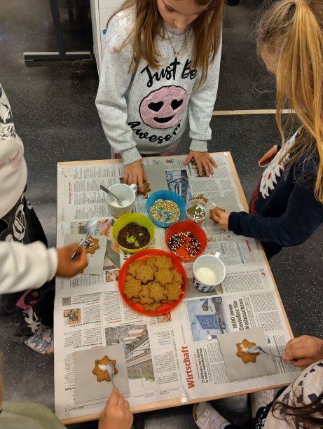 … gibt es manche Leckerei! Bei uns nĂ€mlich köstliche Vanillekipferl und bunt verzierte Nusssterne. Mmmhh! Der Duft war im ganzen Schulhaus wahrzunehmen und das Verkosten hat uns natĂŒrlich sogar noch ein bisschen besser gefallen, als das Keksebacken selbst.