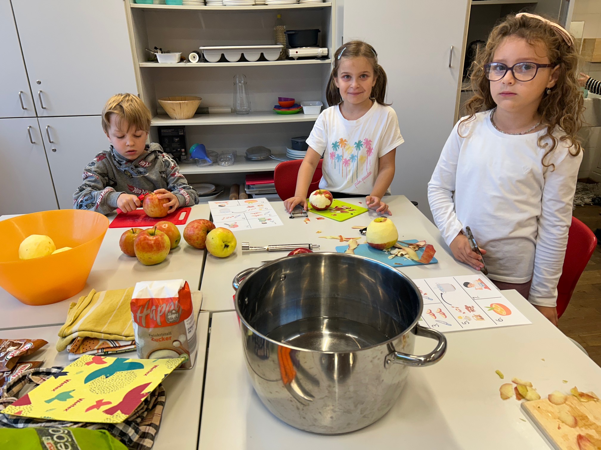 Mit viel Freude können wir auf unsere erste gemeinsame Herbstwoche zurückblicken: In dieser Projektwoche wurde der Stundenplan aufgelöst und es drehte sich fast alles um das Thema Apfel. Gemeinsam haben wir ein Apfellied gesungen, einen Apfel aus Wolle gebastelt, Apfelkompott gekocht und gegessen, über die einzelnen Teile des Apfels gelernt und die Entwicklungsstufen des Apfels in Laufe der Jahreszeiten besprochen.