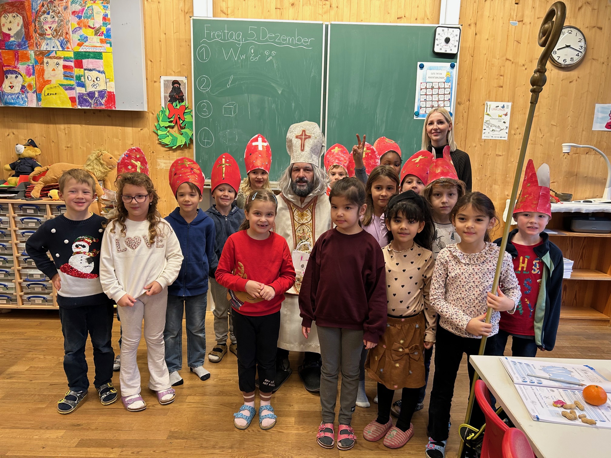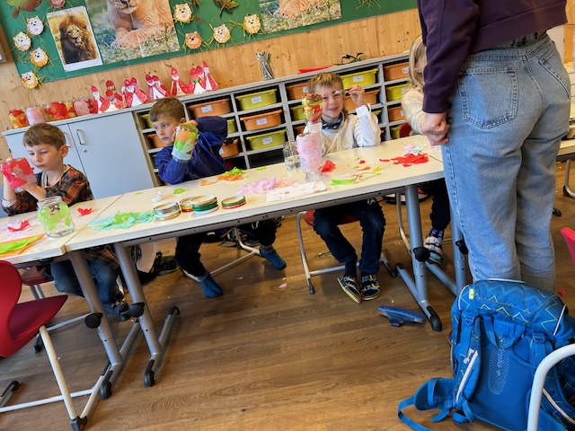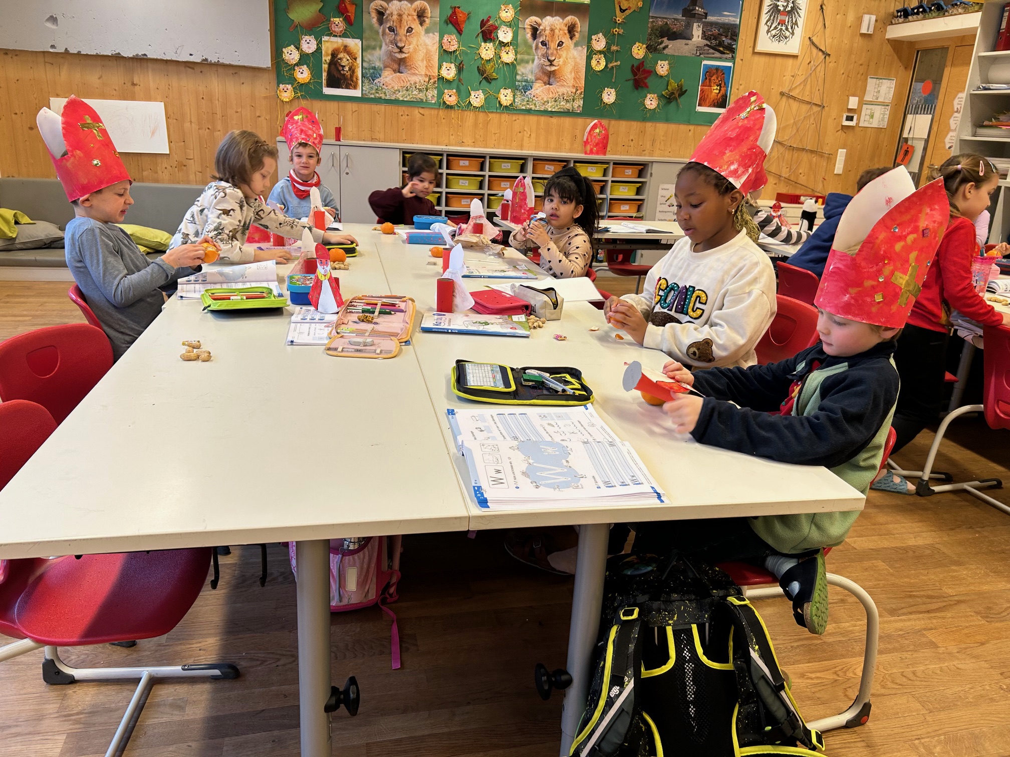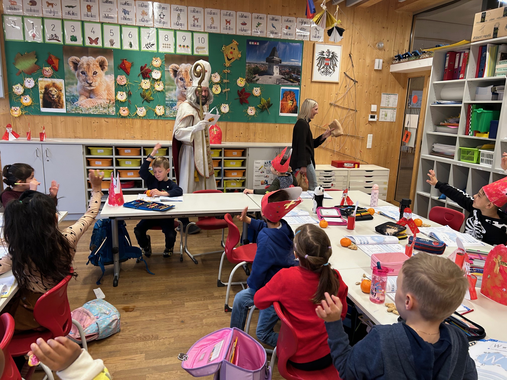 Den Advent zelebrieren wir in unserer Klasse sehr bewusst. Jeden Tag zünden wir die Kerzen am Adventkranz an und die Klassenlehrerin liest im Adventbuch eine Geschichte und wir singen gemeinsam. Das Öffnen des selbst gebastelten Adventkalenders steht ebenso bereits in der Früh auf der Tagesordnung. Damit es auch nach außen adventlich aussieht, haben wir bereits fleißig gebastelt: Faltengel und Bommel-Anhänger für die Drahtseile im Klassenzimmer, transparente Kugeln und Bäume für die Fenster und Riesenkerzen für den Marktplatz vor unserer Klasse. Der Höhepunkt wird die Adventfeier sein, die wir gemeinsam mit den anderen beiden ersten Klassen im Turnsaal feiern werden. Dafür proben wir schon fleißig. An dieser Stelle sei ein herzliches Danke an die Klassenelternvertreterin, Frau Sabitzer, gesagt, die uns einen wunderschönen Adventkranz gezaubert hat, bei dem auf kleinen Kugeln die Namen der Kinder stehen. Danke auch an Frau Rauter, die uns immer wieder mit süßen Köstlichkeiten überrascht :-)!