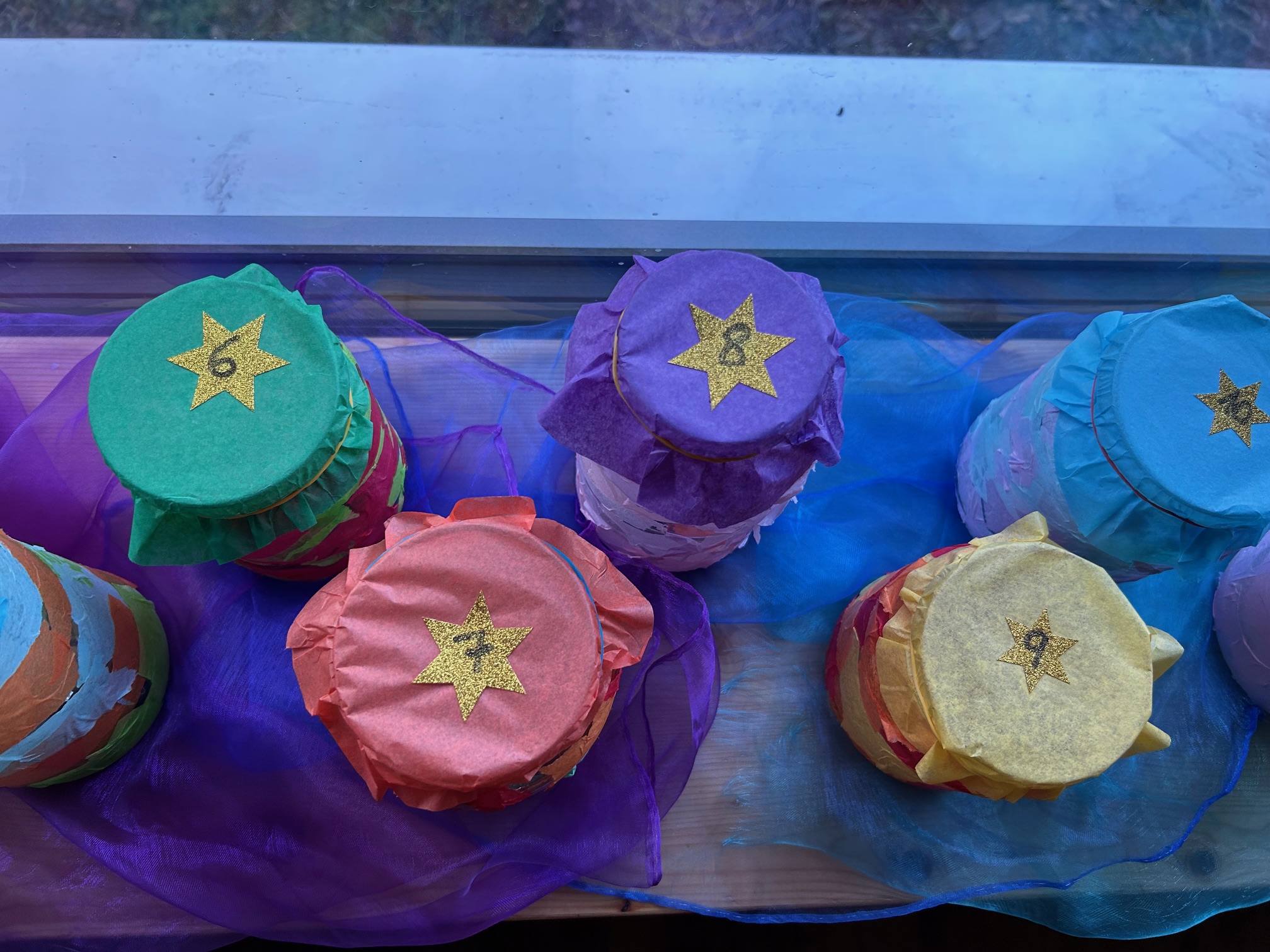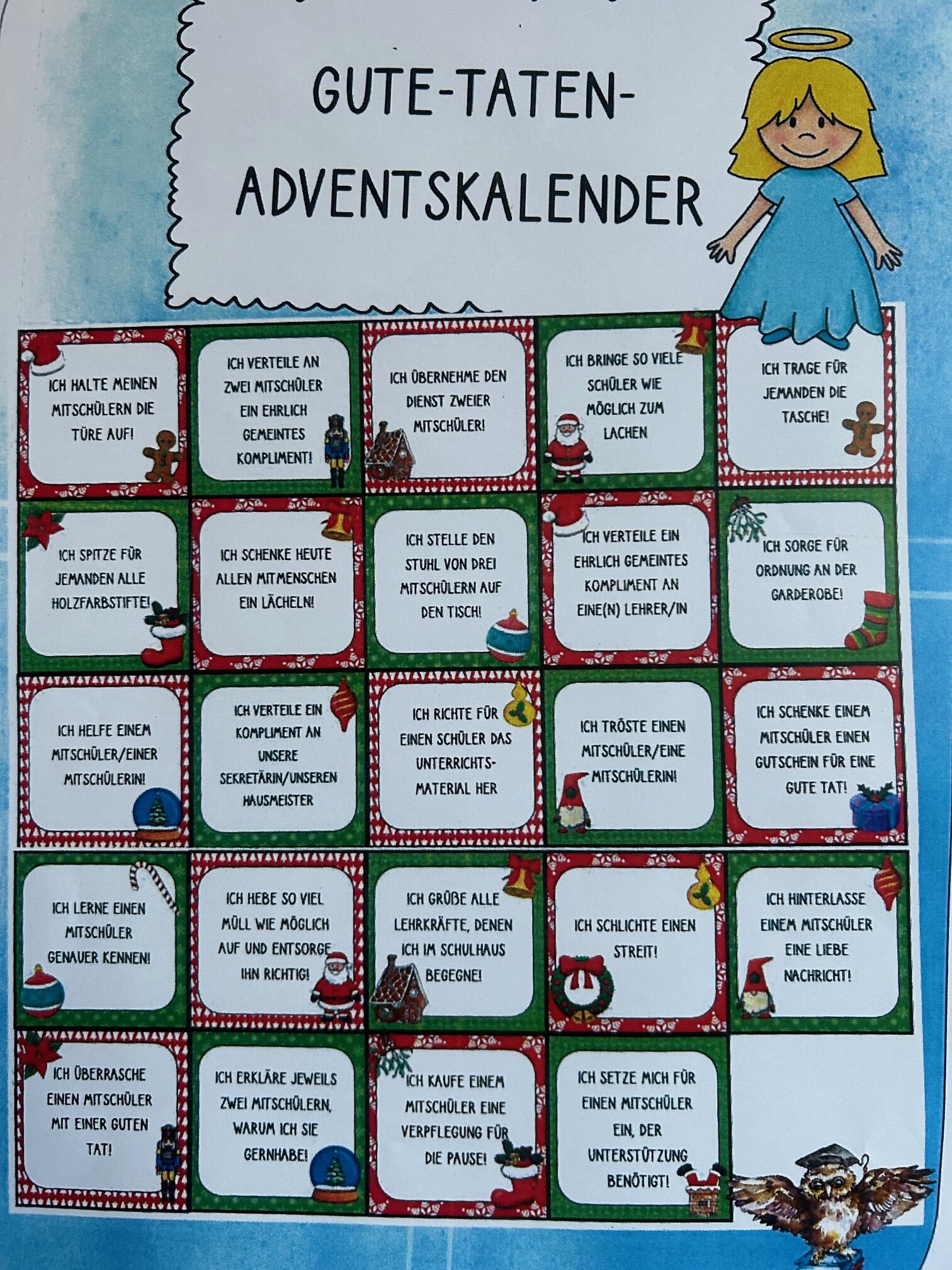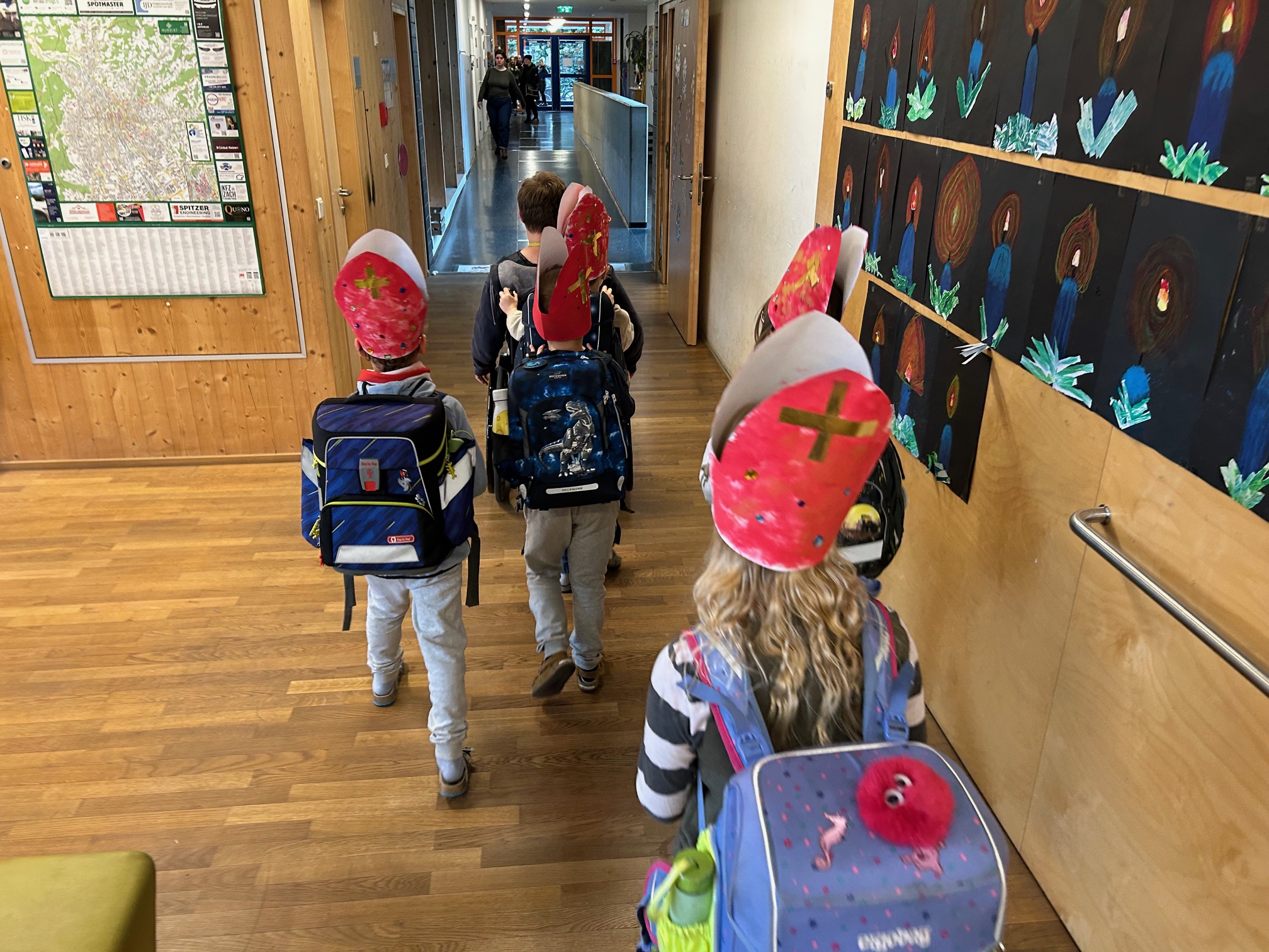 Den Advent zelebrieren wir in unserer Klasse sehr bewusst. Jeden Tag zünden wir die Kerzen am Adventkranz an und die Klassenlehrerin liest im Adventbuch eine Geschichte und wir singen gemeinsam. Das Öffnen des selbst gebastelten Adventkalenders steht ebenso bereits in der Früh auf der Tagesordnung. Damit es auch nach außen adventlich aussieht, haben wir bereits fleißig gebastelt: Faltengel und Bommel-Anhänger für die Drahtseile im Klassenzimmer, transparente Kugeln und Bäume für die Fenster und Riesenkerzen für den Marktplatz vor unserer Klasse. Der Höhepunkt wird die Adventfeier sein, die wir gemeinsam mit den anderen beiden ersten Klassen im Turnsaal feiern werden. Dafür proben wir schon fleißig. An dieser Stelle sei ein herzliches Danke an die Klassenelternvertreterin, Frau Sabitzer, gesagt, die uns einen wunderschönen Adventkranz gezaubert hat, bei dem auf kleinen Kugeln die Namen der Kinder stehen. Danke auch an Frau Rauter, die uns immer wieder mit süßen Köstlichkeiten überrascht :-)!